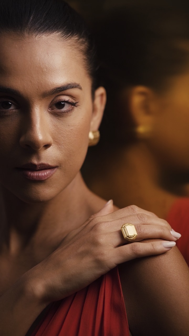 Anel Hepta Dourado, uma peça regulável ( aro 15 a 19) da Coleção Edros que exala elegância e sofisticação. Com 17 facetas que fazem referência aos poliedros, seu design único e autoral se destaca em qualquer ocasião.